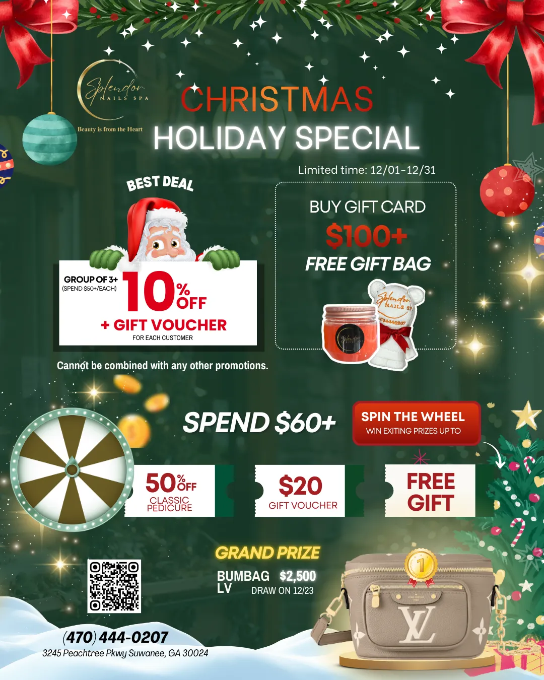 🎄 Spend $60+ → 𝐒𝐏𝐈𝐍 𝐓𝐇𝐄 𝐖𝐇𝐄𝐄𝐋 Win prizes like: ✔️ 50% OFF Classic Pedicure ✔️ $20 Gift Voucher ✔️ FREE Gift ✔️ Bonus surprises all month long!